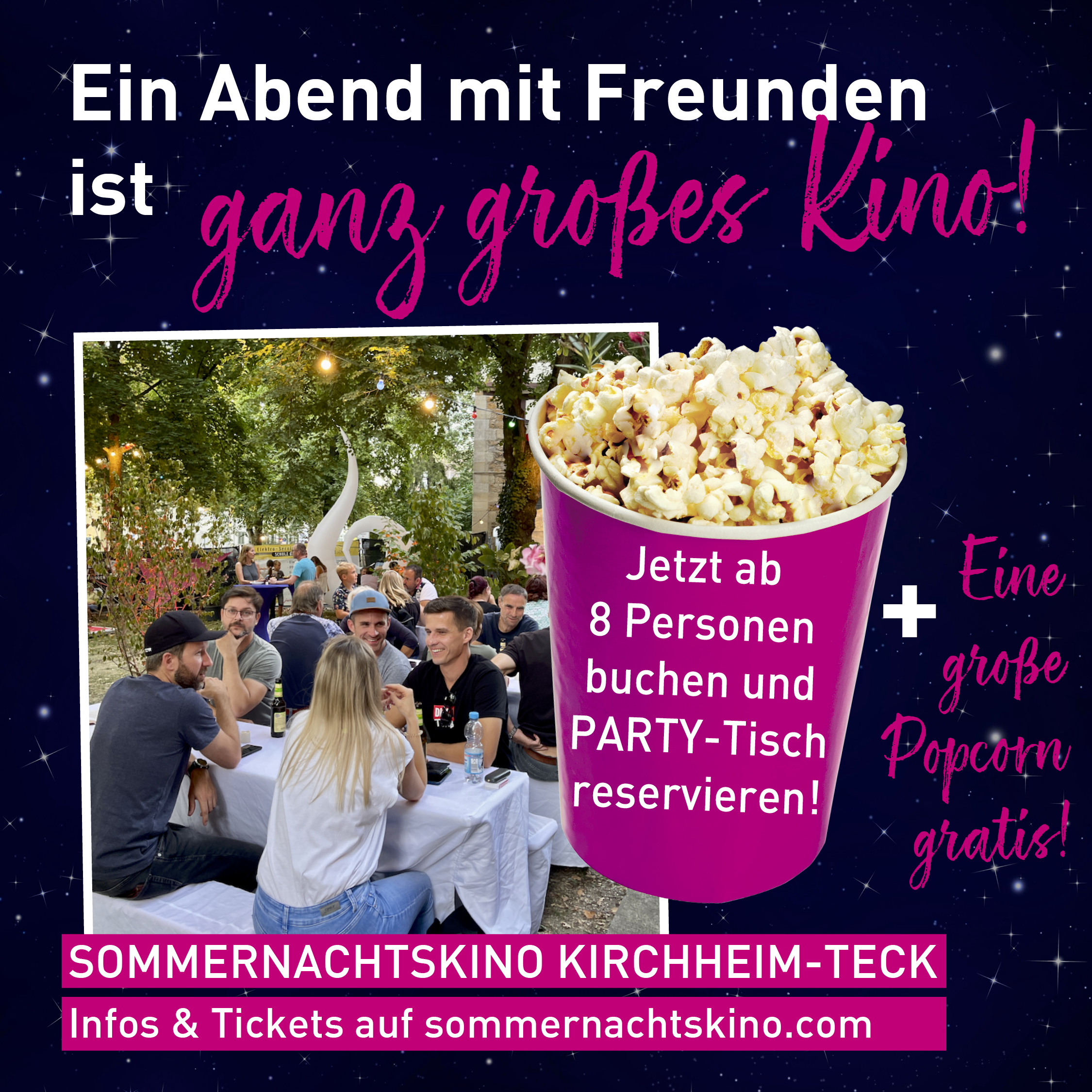 Mal wieder Zeit für einen netten Mädelsabend oder für ein Bierchen mit deinen Jungs? Bei einem gemütlichen Openair-Kinoabend? Ihr seid 8 Personen oder mehr? Sucht euch euren Lieblingsfilm aus und schreibt uns, nachdem ihr eure Tickets gebucht habt, eine Mail an kirchheim@sommernachtskino.com. Wir reservieren euch einen Tisch in unserer KINO-Gastronomie, damit ihr entspannt den Abend anklingen lassen könnt. On Top gibt es für euch eine große Popcorn auf’s Haus!