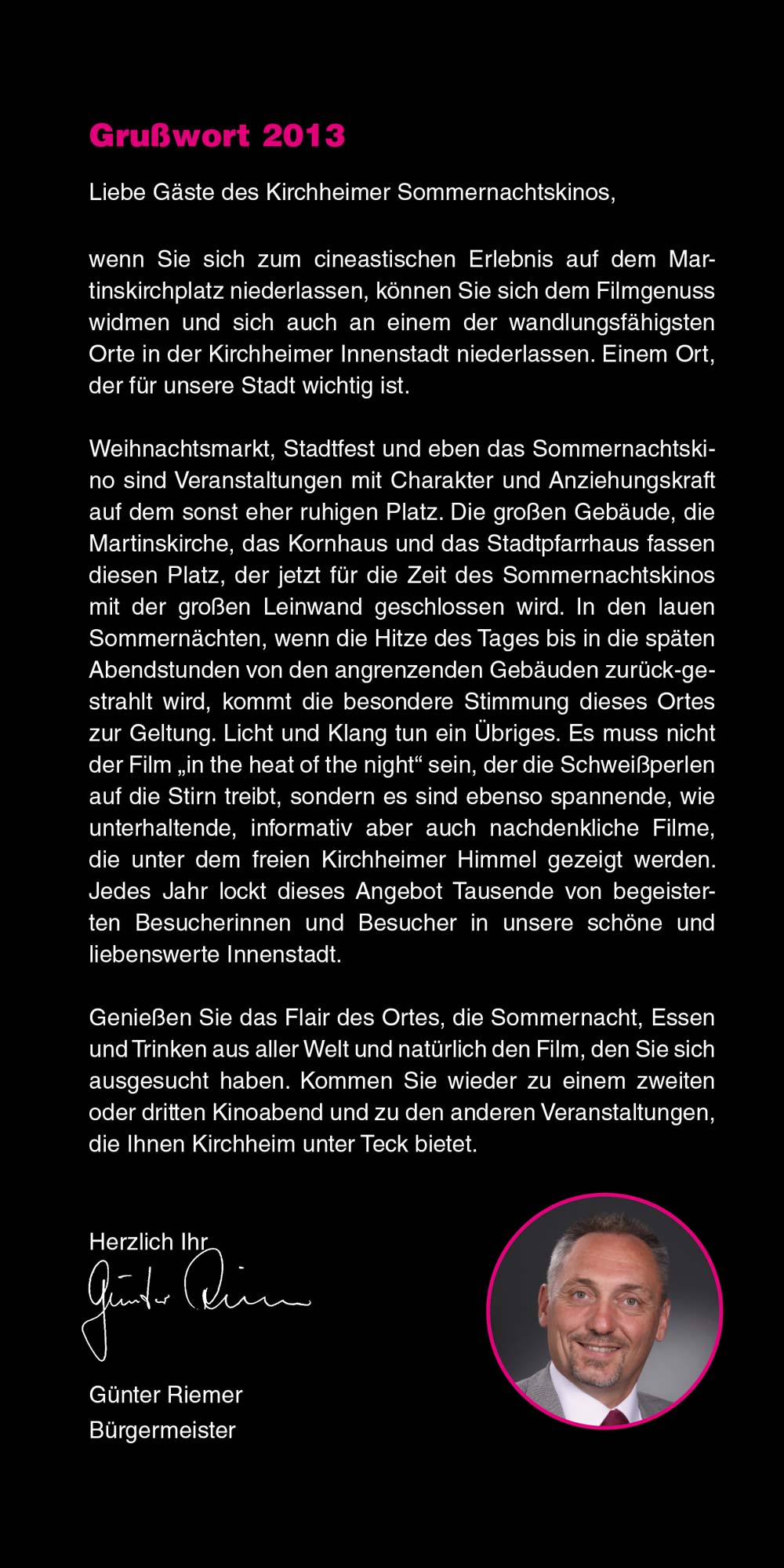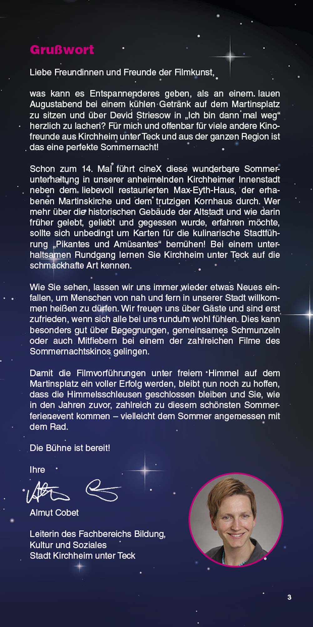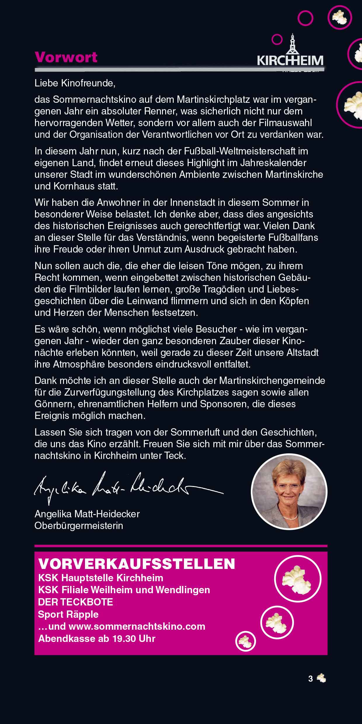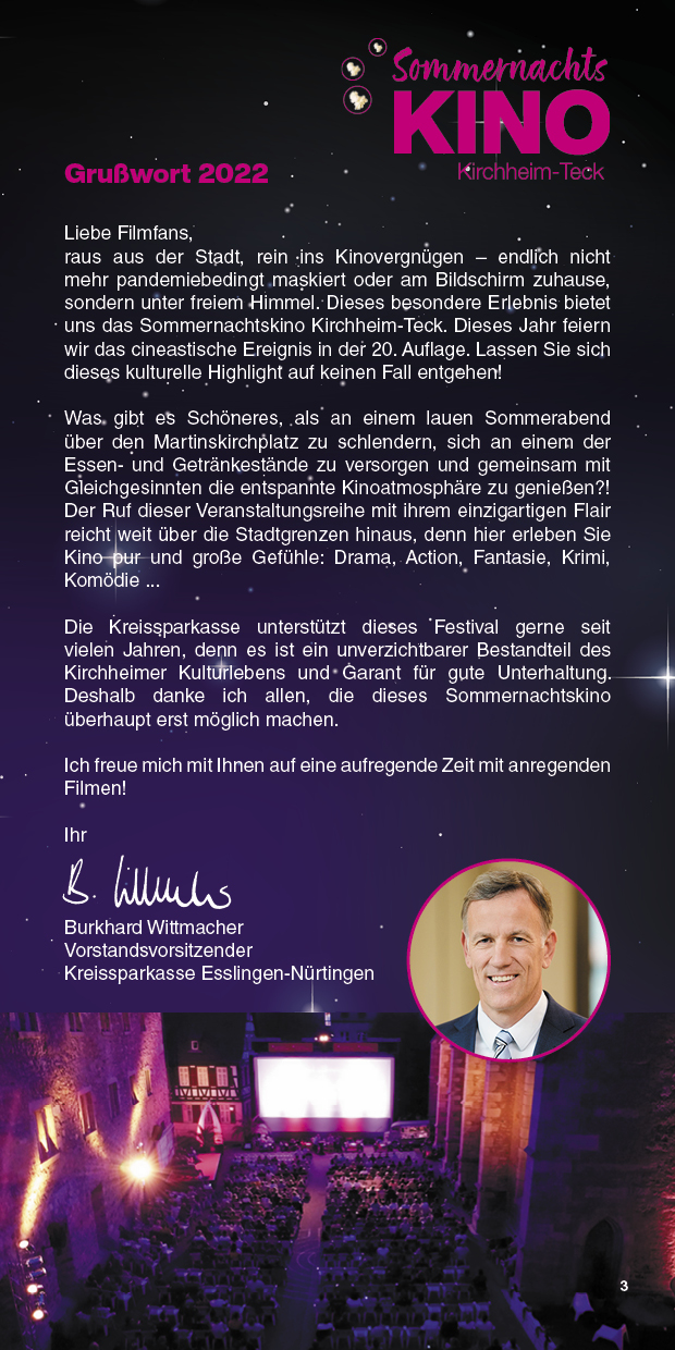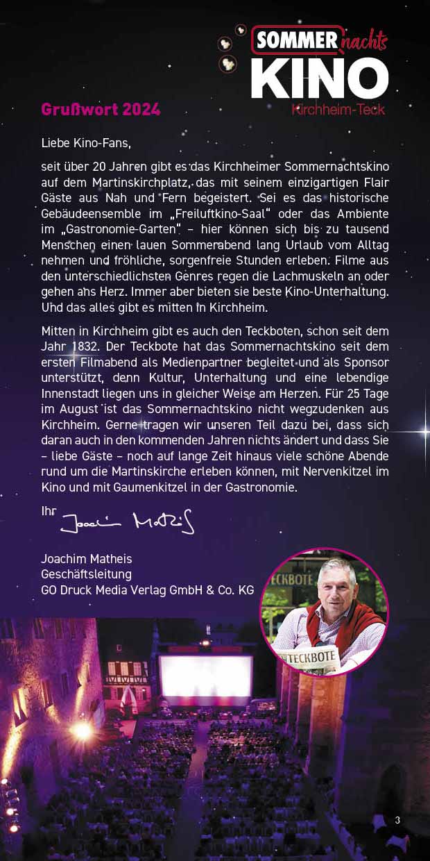Das Sommernachtskino lädt Sie ein, innezuhalten, zu entspannen und unvergessliche Kinoabende zu erleben – mitten in unserer lebendigen Stadt und vor einzigartiger Kulisse. Liebe Besucherinnen und Besucher, genießen Sie die Filmnächte, die tolle Kulinarik und die Atmosphäre des Ortes. Und wenn Sie schon einmal hier sind, entdecken Sie gerne vorher oder nachher die schöne Kirchheimer Innenstadt. "Ich glaube, dies ist der Beginn einer wunderbaren Freundschaft" – Humphrey Bogart in Casablanca.