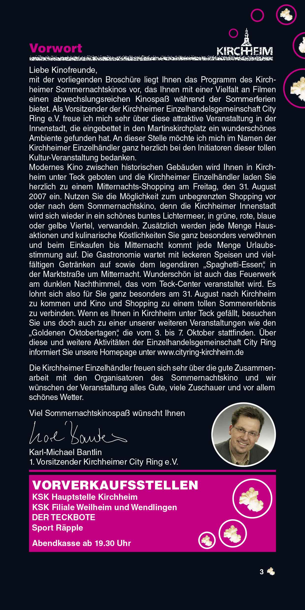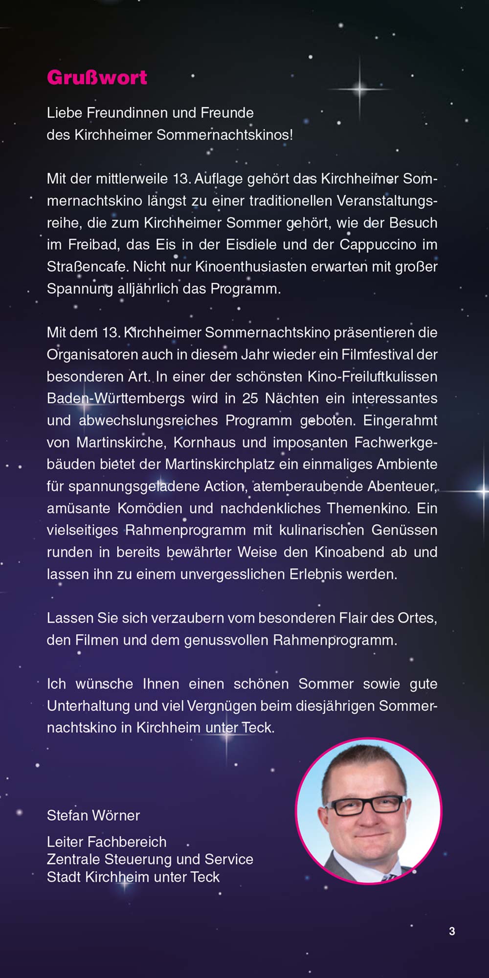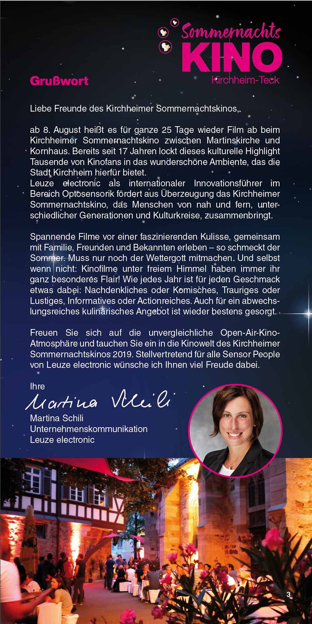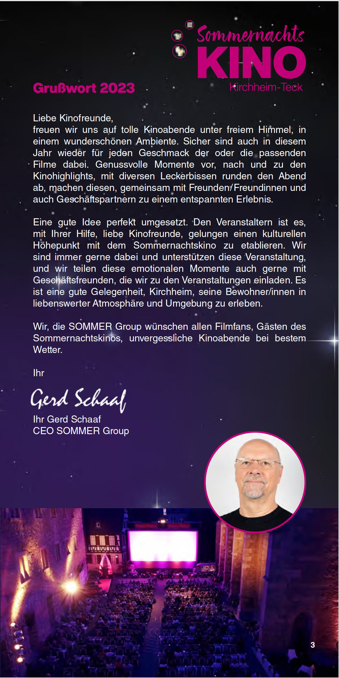 Das Sommernachtskino lädt Sie ein, innezuhalten, zu entspannen und unvergessliche Kinoabende zu erleben – mitten in unserer lebendigen Stadt und vor einzigartiger Kulisse. Liebe Besucherinnen und Besucher, genießen Sie die Filmnächte, die tolle Kulinarik und die Atmosphäre des Ortes. Und wenn Sie schon einmal hier sind, entdecken Sie gerne vorher oder nachher die schöne Kirchheimer Innenstadt. "Ich glaube, dies ist der Beginn einer wunderbaren Freundschaft" – Humphrey Bogart in Casablanca.