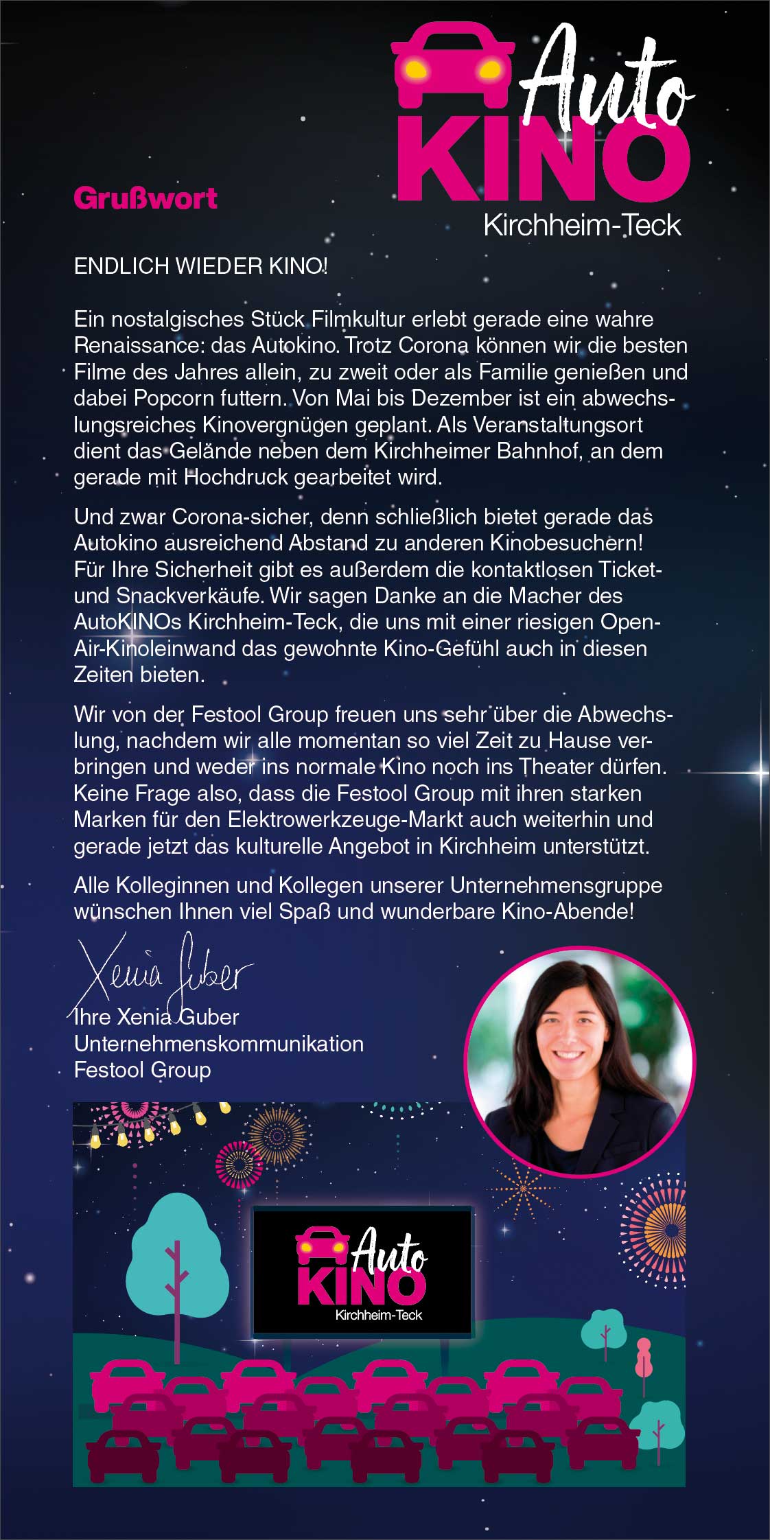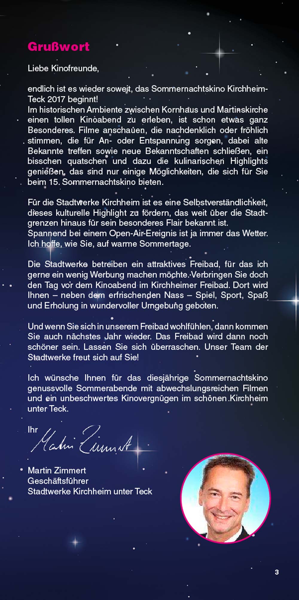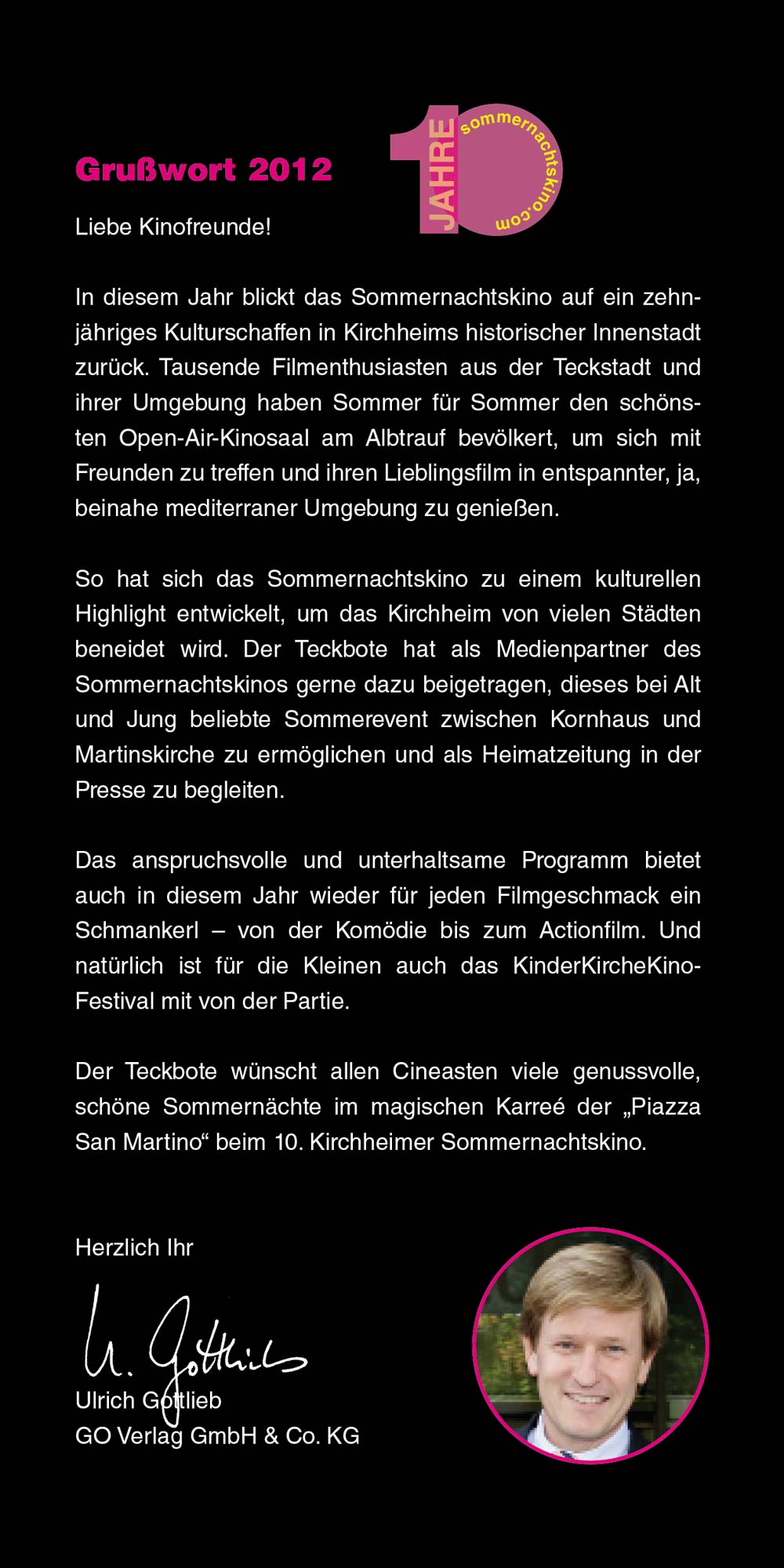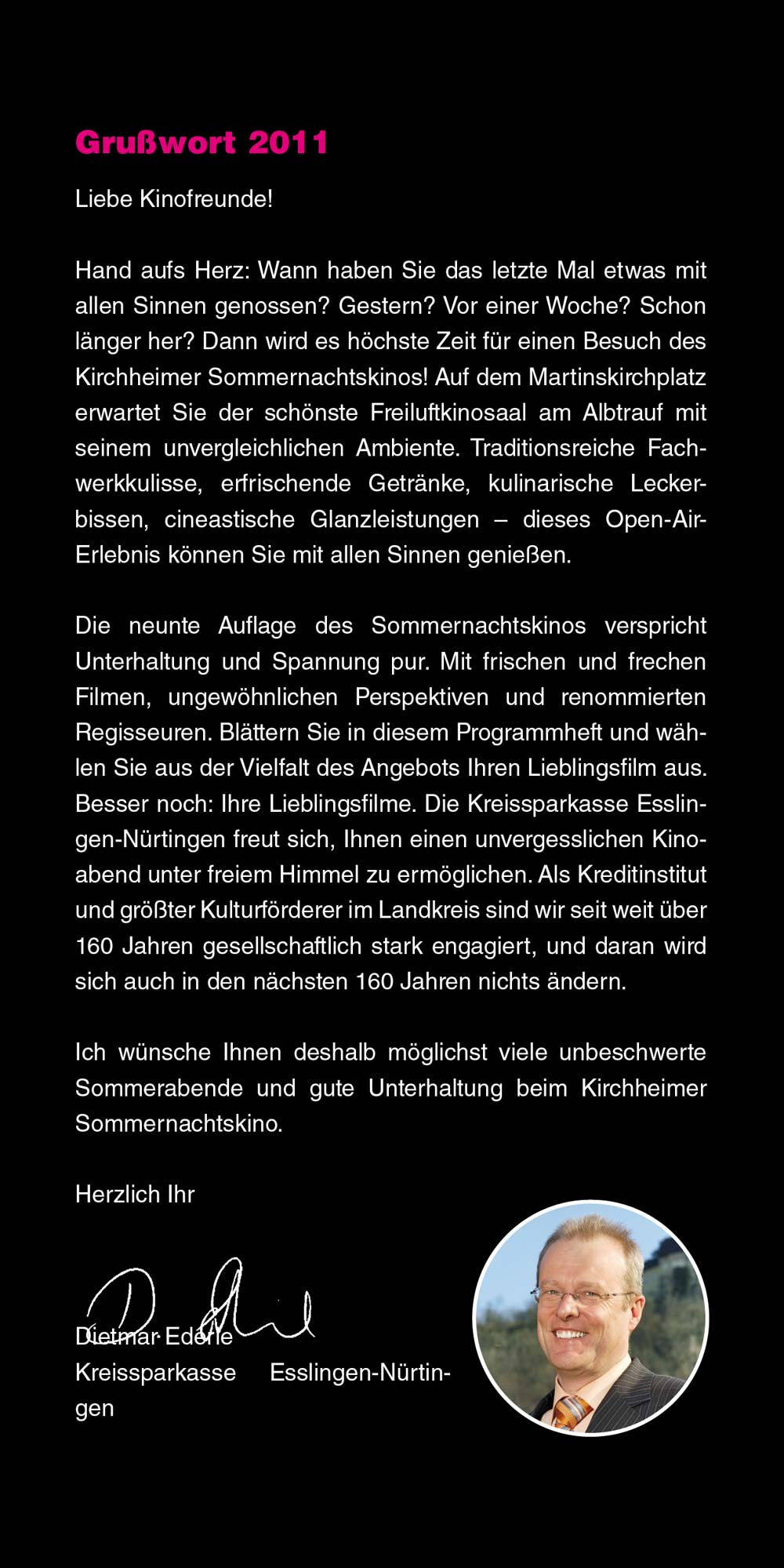Das Sommernachtskino lädt Sie ein, innezuhalten, zu entspannen und unvergessliche Kinoabende zu erleben – mitten in unserer lebendigen Stadt und vor einzigartiger Kulisse. Liebe Besucherinnen und Besucher, genießen Sie die Filmnächte, die tolle Kulinarik und die Atmosphäre des Ortes. Und wenn Sie schon einmal hier sind, entdecken Sie gerne vorher oder nachher die schöne Kirchheimer Innenstadt. "Ich glaube, dies ist der Beginn einer wunderbaren Freundschaft" – Humphrey Bogart in Casablanca.