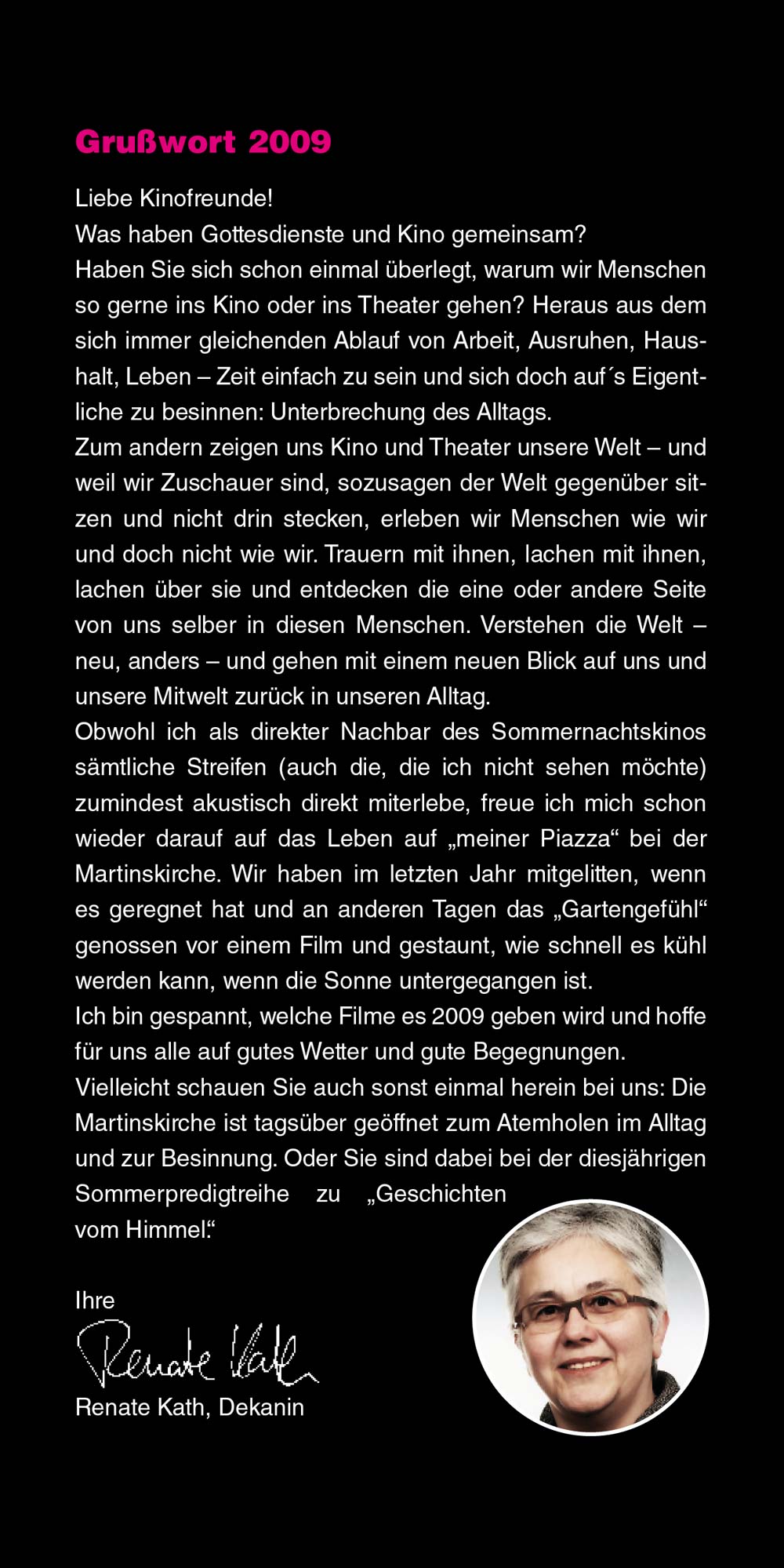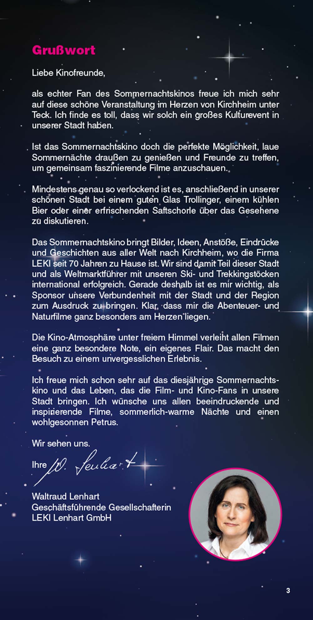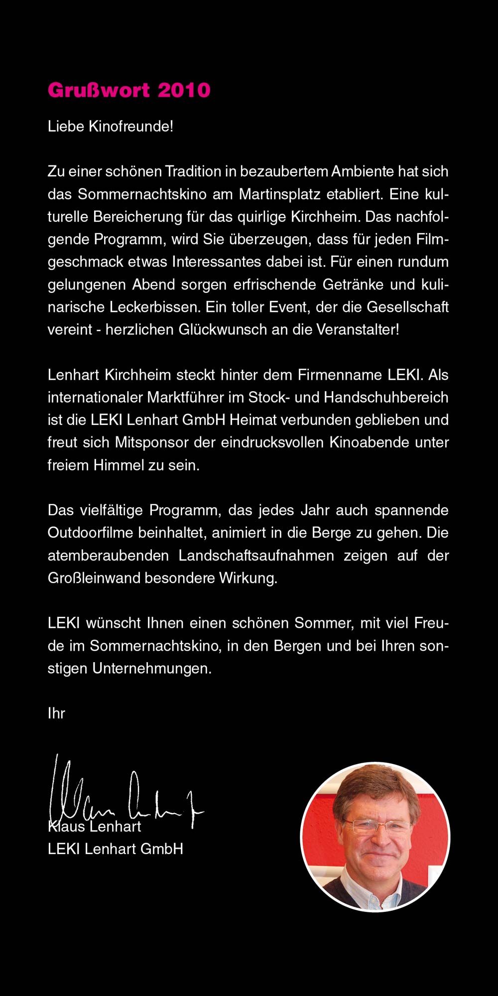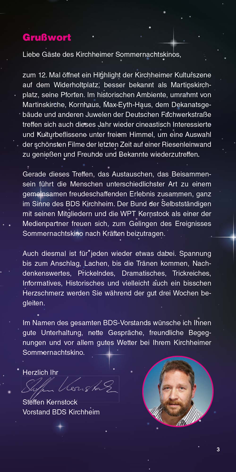 Das Sommernachtskino lädt Sie ein, innezuhalten, zu entspannen und unvergessliche Kinoabende zu erleben – mitten in unserer lebendigen Stadt und vor einzigartiger Kulisse. Liebe Besucherinnen und Besucher, genießen Sie die Filmnächte, die tolle Kulinarik und die Atmosphäre des Ortes. Und wenn Sie schon einmal hier sind, entdecken Sie gerne vorher oder nachher die schöne Kirchheimer Innenstadt. "Ich glaube, dies ist der Beginn einer wunderbaren Freundschaft" – Humphrey Bogart in Casablanca.